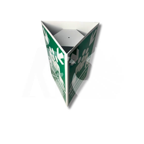 Znak przestrzenny Miejsce zbiórki do ewakuacji 3D służy do jednoznacznego wskazania punktu zbiorczego, w którym należy zgromadzić się podczas ewakuacji budynku. Dzięki trójstronnej konstrukcji jest wyraźnie widoczny z każdej strony, co znacząco ułatwia szybkie odnalezienie bezpiecznego miejsca w sytuacji zagrożenia.
